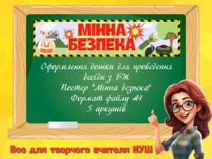 Оформлення класної дошки для проведення бесіди чи виховного заходу з безпеки життєдіяльності . Постер “Мінна безпека” .