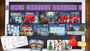 День Святого Миколая (інтерактивна анімована презентація, подяки, розтяжка, велика розмальовка, додатки та конспект до презентації)