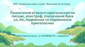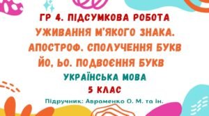 ГР 4. Підсумкова робота №6. Уживання м’якого знака. Апостроф. Сполучення букв йо, ьо. Подвоєння букв. Українська мова. 5 клас НУШ (підручник: Авраменко О. М. та ін.).