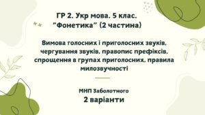 ГР 2. Підсумкова (діагностична) робота з української мови для 5 класу (вимова голосних і приголосних звуків, чергування звуків, правопис префіксів, спрощення в групах приголосних, правила милозвучност