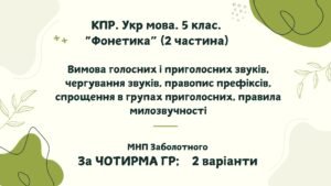ГР 4. Підсумкова (діагностична) робота з укр. мови для 5 класу (вимова голосних і приголосних звуків, чергування звуків, правопис префіксів, спрощення в групах приголосних, правила милозвучності)