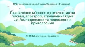 ГР 2. Підсумкова (діагностична) робота з української мови для 5 класу “Фонетика 3 частина) МНП Заболотного. Об’єднує теми вживання ьо, йо, правопис м’якого знака та апострофа, збіг та подовження приг.