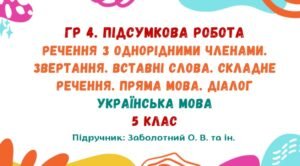 ГР 4. Підсумкова робота №8. Речення з однорідними членами. Звертання. Вставні слова та сполучення слів. Складне речення. Пряма мова. Діалог. Українська мова. 5 клас НУШ (підручник: Заболотний О. В.).