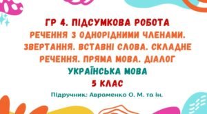 ГР 4. Підсумкова робота №8. Речення з однорідними членами. Звертання. Вставні слова та сполучення слів. Складне речення. Пряма мова. Діалог. Українська мова. 5 клас НУШ (підручник: Авраменко О. М.).