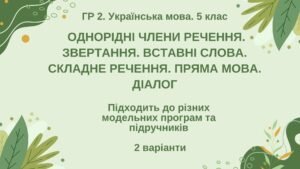 ГР 2. Підсумкова (діагностична) робота з української мови для 5 класу НУШ. Тема “Однорідні члени речення. Звертання. Вставні слова. Складне речення. Пряма мова. Діалог”.