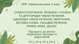 КПР з української мови для 5 класу. “Словосполучення. Речення. Головні та другорядні члени речення. Однорідні члени речення. Звертання. Вставні слова. Складне речення. Пряма мова. Діалог”