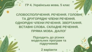 ГР 4. Підсумкова робота з укр. мови для 5 класу. “Словосполучення. Речення. Головні та другорядні члени речення. Однорідні члени речення. Звертання. Вставні слова. Складне речення. Пряма мова. Діалог
