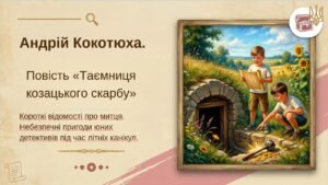 А. Кокотюха. Повість “Таємниця козацького скарбу”. Короткі відомості про митця. Небезпечні пригоди юних детективів під час літніх канікул.”, що побудована в стилі WOW-уроку. 48 СЛАЙДІВ,