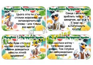 Пропоную до вашої уваги передбачення від крутого гусака для учнів на літні канікули 2025. Розробка містить 40 різних передбачення для друку – 10 сторінок по 4 на кожній. Формат – pptx (презентація)