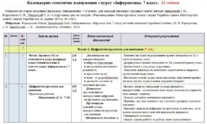 Календарно-тематичне планування «Інформатика”. 7 клас. 52 години. З групами результатів. За підручником Коршунова О. та модельною програмою авторів Завадський І., Коршунова О., Твердохліб І.