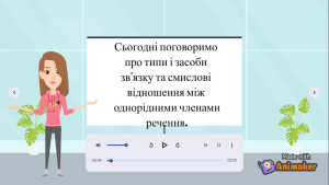 Навчальне відео створене на платформі https://app.animaker.com/dashboard. Містить короткі точні відомості про смислові відношення, типи зв’язку між однорідними членами речення, особливості інтонації.