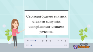 Навчальне відео створене на платформі https://app.animaker.com/dashboard. Містить короткі точні відомості про кому між однорідними членами речення, приклади. Підійде для використання на уроці.
