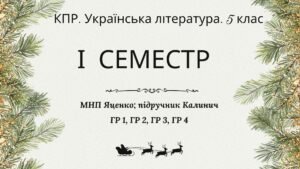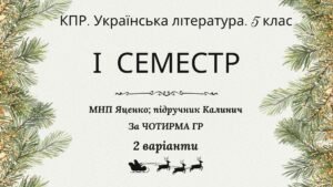 ГР 4. Підсумкова робота з укр літ за І СЕМЕСТР для 5 класу, за МНП Яценко, підручник Яценко. КПР охоплює розділи “Малі жанри фольклору та л-и”, “Народні та літературні казки”, “Минуле укр. народу”