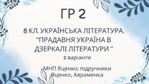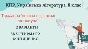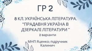 ГР 2. Підсумкова (діагностична) робота. 8 клас. Українська література. “Прадавня Україна в дзеркалі літератури”. 2 варіанти за модельною навчальною програмою Яценко, підручником Калинич.