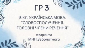ГР 3. Підсумкова (діагностична) робота. 8 клас. Українська мова. “Словосполучення. Головні члени речення”. 2 варіанти за модельною навчальною програмою Заболотного.