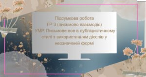 Підсумкова робота. ГР 3 (письмово взаємодіє). УМР. Письмове есе в публіцистичному стилі з використанням дієслів у неозначеній формі 7 клас. Українська мова.