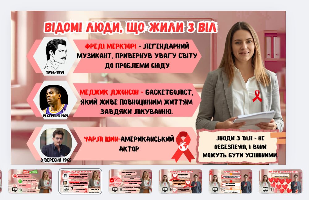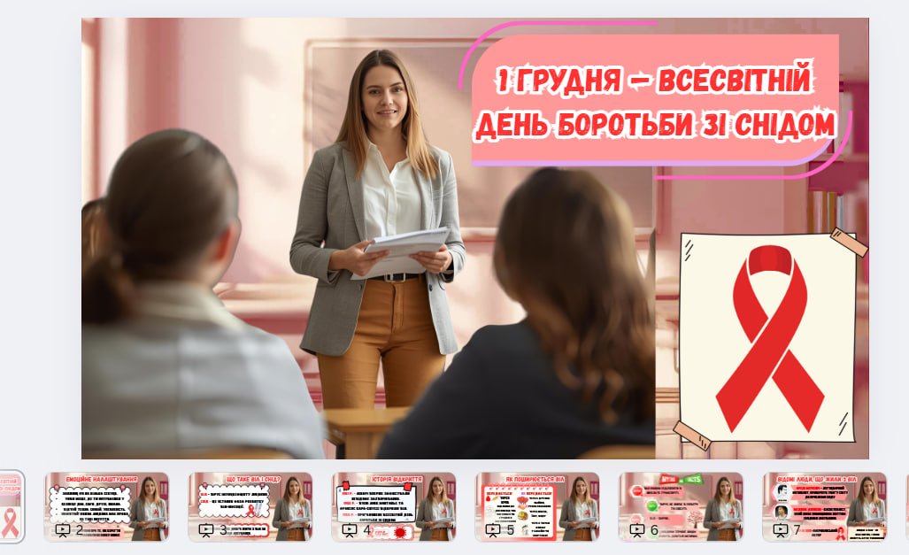 Матеріал охоплює ключові факти про ВІЛ та СНІД, шляхи передачі й методи профілактики, сучасні міфи та їх спростування, статистику, важливість толерантного ставлення до людей, які живуть з ВІЛ, а також практичні поради для учнів. Презентація розроблена у доступній для школярів формі та може бути використана для проведення класної години або виховного заходу