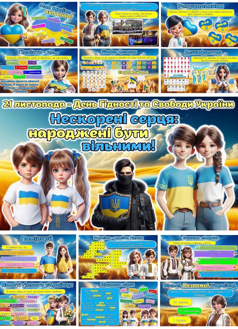 21 листопада – День Гідності та Свободи України. Анімована інформаційно-ігрова презентація “Нескорені серця: народжені бути вільними”