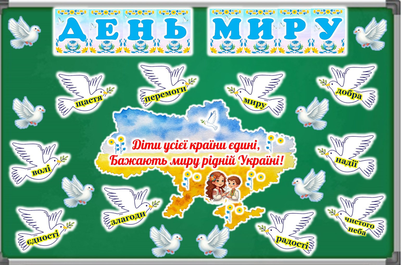 - велика карта України з написом «Діти усієї країни єдині, бажають миру рідній Україні!» (9 аркушів, два варіанти оформлення);