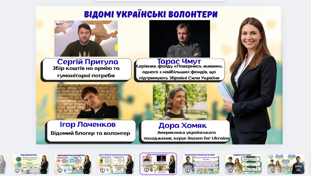 - Блоки про міжнародні та українські волонтерські організації, їхню місію та досягнення.