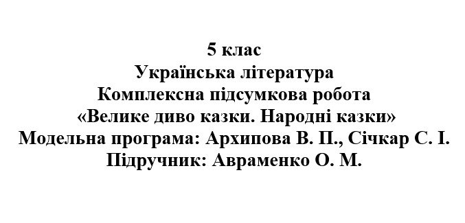 КОМПЛЕКСНА ПІДСУМКОВА РОБОТА за темою “Велике диво казки. Літературні казки” (5 кл.)