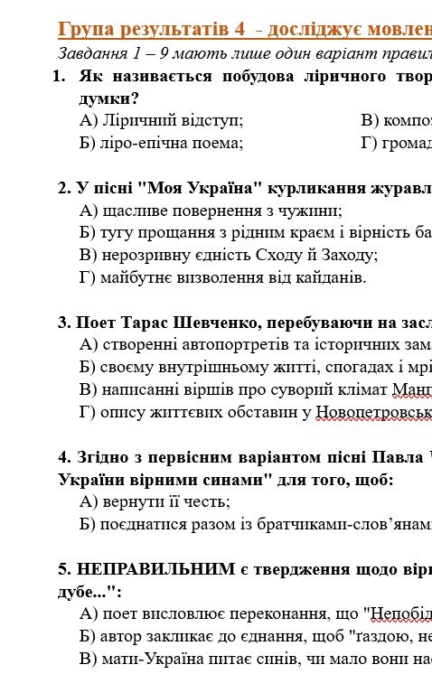 ГР 4 – тестові завдання за прочитаними творами; два завдання на встановлення відповідностей.
