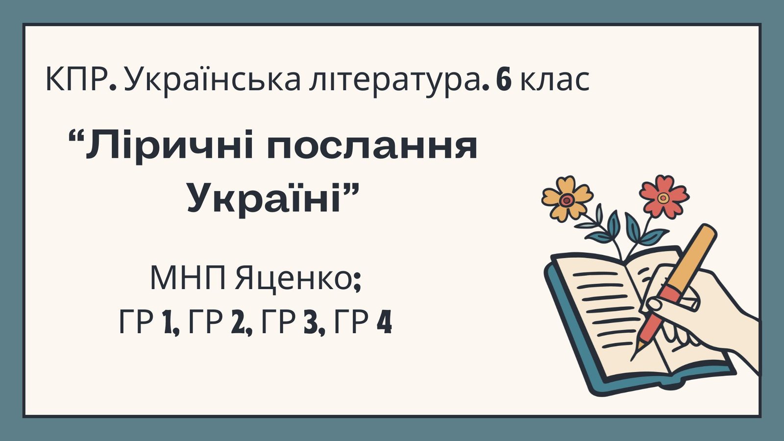 Комплексна підсумкова робота з української літератури для 6 класу за чотирма групами результатів “Ліричні послання Україні” (МНП Яценко). Охоплює творчість П .Чубинського, Т. Шевченка, І. Франка, М. Вороного, М. Ткача, Д. Кременя.