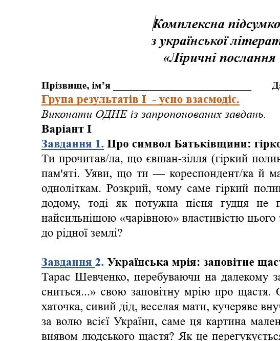 ГР 1 – по ТРИ завдання в кожному варіанті на вибір учителя/ьки або учня/ениці, що безпосередньо пов’язані з тематикою прочитаних творів;
