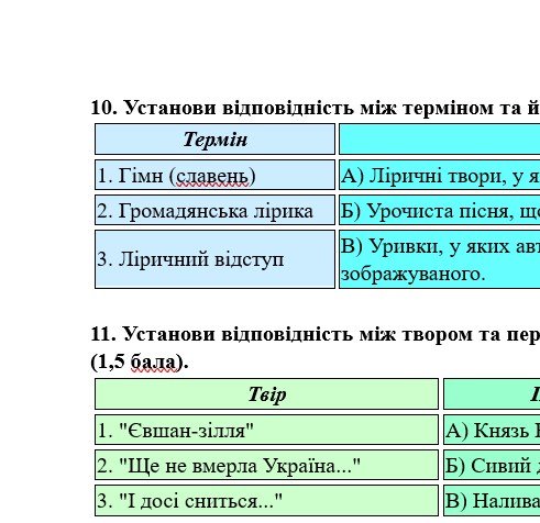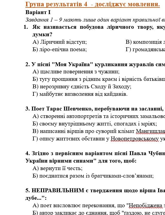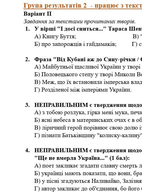 ГР 4 – тестові завдання за прочитаними творами; два завдання на встановлення відповідностей.