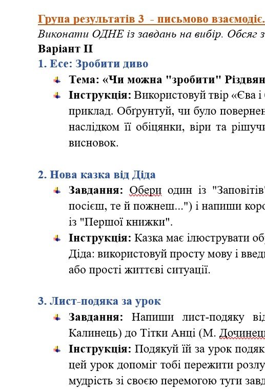 ГР 3 – ТРИ завдання на вибір учня/учениці (або вчителя/ьки) – написання цікавих і креативних творчих робіт, пов’язаних з прочитаними творами – 2 варіанти;
