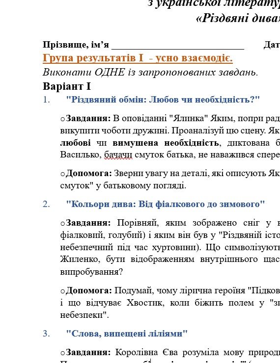 Комплексна підсумкова робота з української літератури для 6 класу за чотирма групами результатів “Різдвяні дива” (МНП Яценко; підручник Калинич). Охоплює творчість І. Калинця, Б. Матіяш, О. Гавроша.