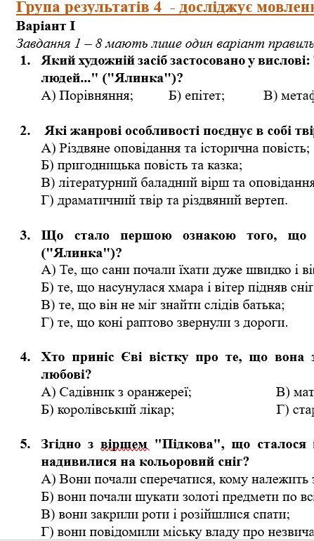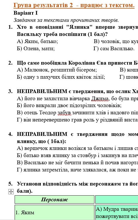 - ГР 4 – тестові завдання за прочитаними творами; два завдання на встановлення відповідностей – 2 варіанти.