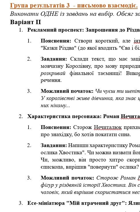 - ГР 3 – ТРИ завдання на вибір учня/учениці (або вчителя/ьки) – написання цікавих і креативних творчих робіт, пов’язаних з прочитаними творами – 2 варіанти;