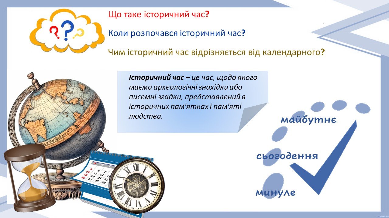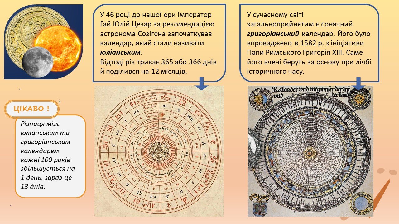 Презентація «Як виникли системи літочислення» допоможе провести цікавий і змістовний урок. Матеріал містить велику кількість зображень, структурований і поданий у доступній формі. Розглядаються питання: Якими одиницями вимірюють час?; Які види календарів винайшли в давнину?; Чому історики використовують єдину систему лічби часу?; Які існують способи упорядкування історичного часу? Матеріал може використовуватися як для проведення уроку у дистанційному форматі, так і для самостійного опрацювання теми уроку здобувачами освіти.