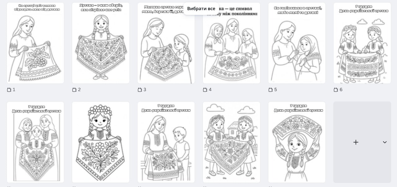 Вони зображують дівчат і жінок у вишиванках, які тримають традиційні українські хустки з квітковими та геометричними орнаментами, готові до розфарбовування дітьми та дорослими.