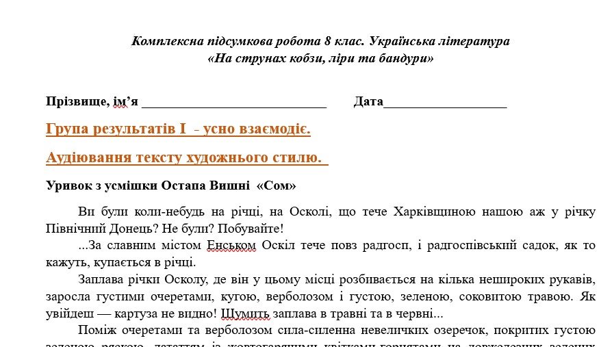 ГР 1 – аудіювання тексту художнього стилю (уривок із усмішки Остапа Вишні “Сом” – 2 варіанти;