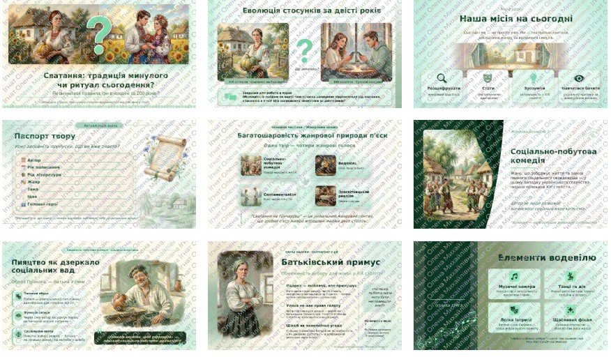Тема, WOW-хук “Сватання: традиції минулого чи ритуал сьогодення”, Еволюція стосунків за 200 років”, мета уроку, шлях до розуміння жанрових особливостей (мальовнича мапа), актуалізація (заповнення паспорту твору (повторення), багатошаровість жанрової природи п’єси, “Один твір – чотири жанрові голоси”, ДЕТАЛЬНИЙ та ПОКРОКОВИЙ аналіз усіх ЧОТИРЬОХ жанрових ознак з прикладами з твору та питаннями для обговорення, елементи водевілю.