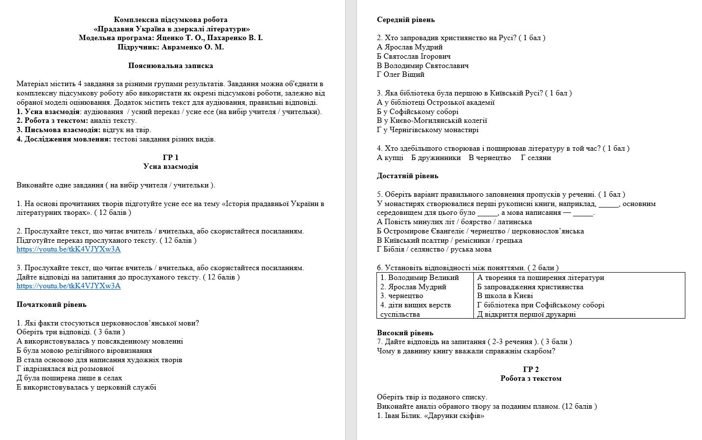 8 клас. Українська література. Комплексна підсумкова робота “Прадавня Україна в дзеркалі літератури” ( підручник Авраменка )