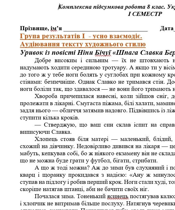 ГР 1 – аудіювання тексту художнього стилю (уривок із повісті Ніни Бічуя “Шпага Славка Беркути”) АБО ТРИ завдання на вибір учителя/ьки або учня/ениці (креативні актуальні завдання, пов’язані з тематикою вивченого розділу та прочитаних творів) 2 варіанти;