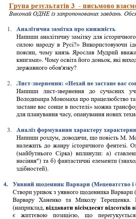 ГР 3 – ЧОТИРИ креативних творчих завдання на вибір учня/учениці (написання різних творчих робіт на тематику прочитаних творів (з поясненням)) – 2 варіанти;