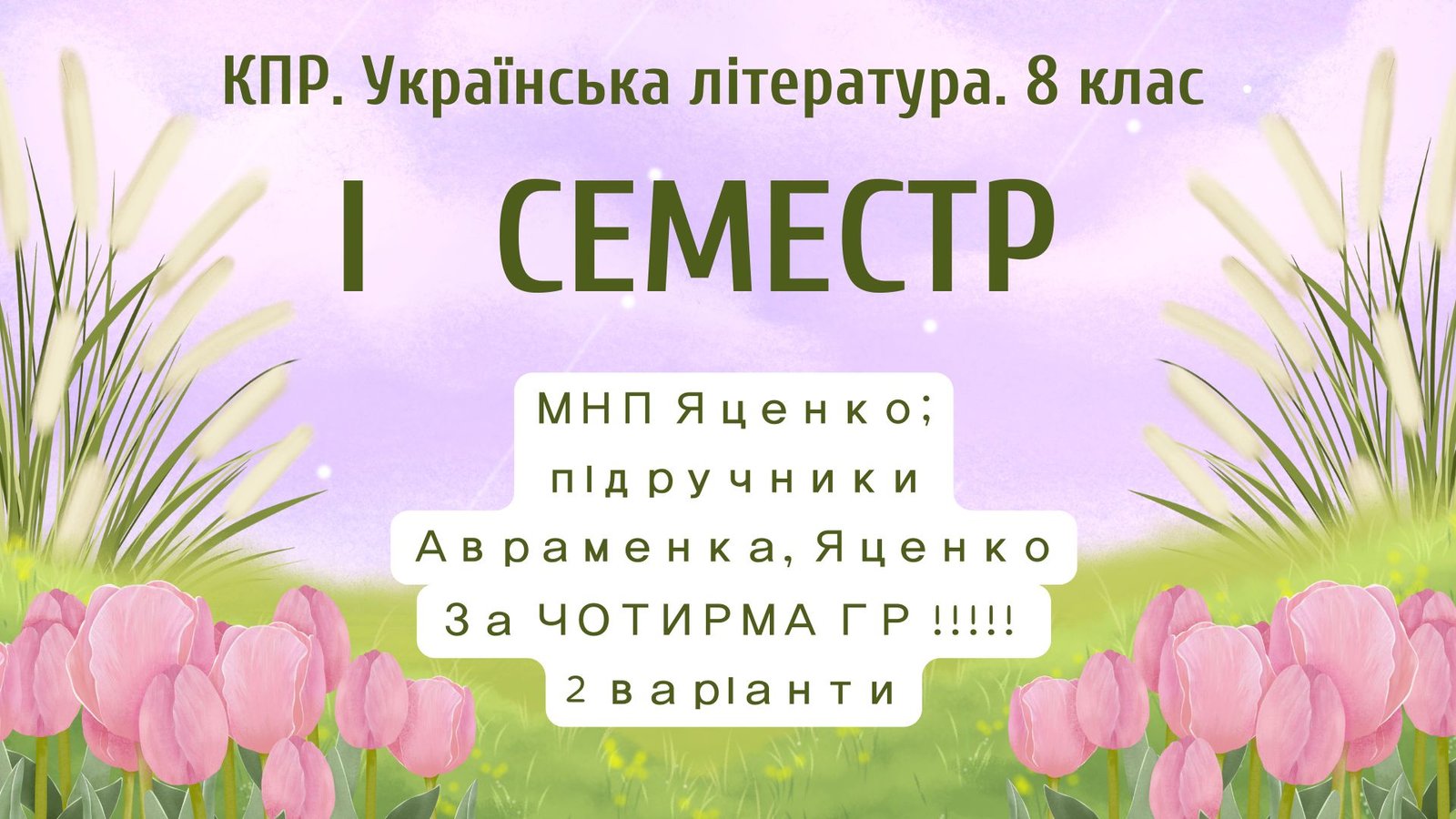 Комплексна підсумкова ( 1 СЕМЕСТР) робота з української літератури для 8 класу за ЧОТИРМА ГР за модельною навчальною програмою Яценко; підручники Авраменка, Яценко. Робота охоплює розділи “Прадавня Україна в дзеркалі літератури”, “Заповідь любові: Біблія та українська література”, “Література козацької України”