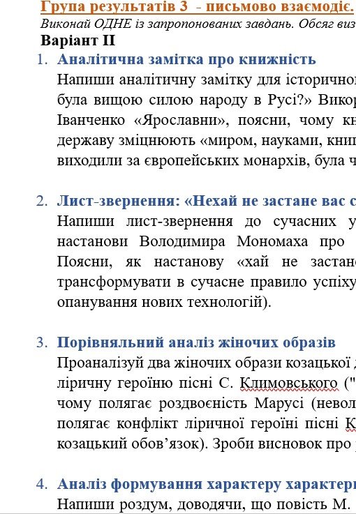 ГР 3 – ЧОТИРИ креативних творчих завдання на вибір учня/учениці (написання різних творчих робіт на тематику прочитаних творів (з поясненням)) – 2 варіанти;