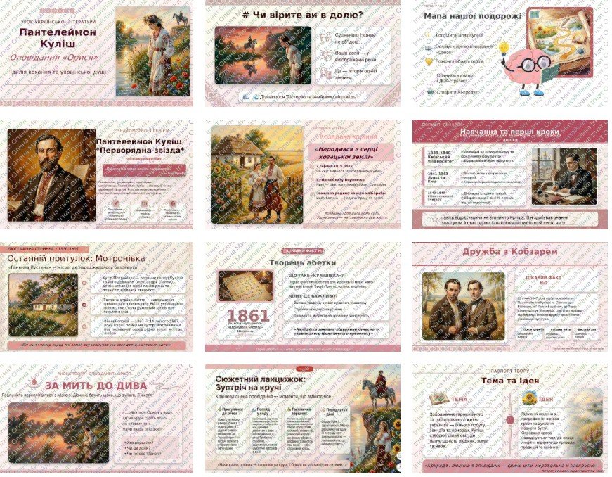 Українська література. 8 клас НУШ. Сучасна, наповнена структурованим матеріалом, у дуже гарному дизайні ПРЕЗЕНТАЦІЯ на 50 слайдів. Тема (позакласне читання) “Пантелеймон Куліш. Оповідання “Орися””.