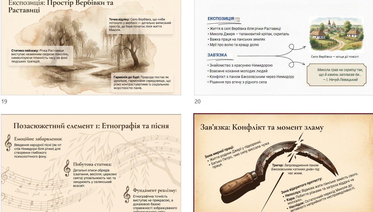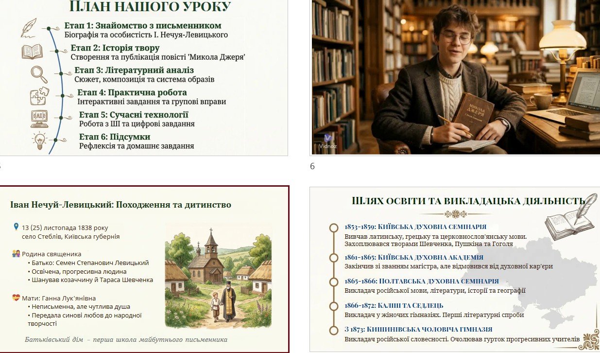 Сучасна змістовна презентація на тему “Коротко про Івана Нечуя-Левицького. Сюжет та композиція повісті “Микола Джеря” (42 слайди). Переходи між етапами презентації озвучує аватар хлопчик-підліток.