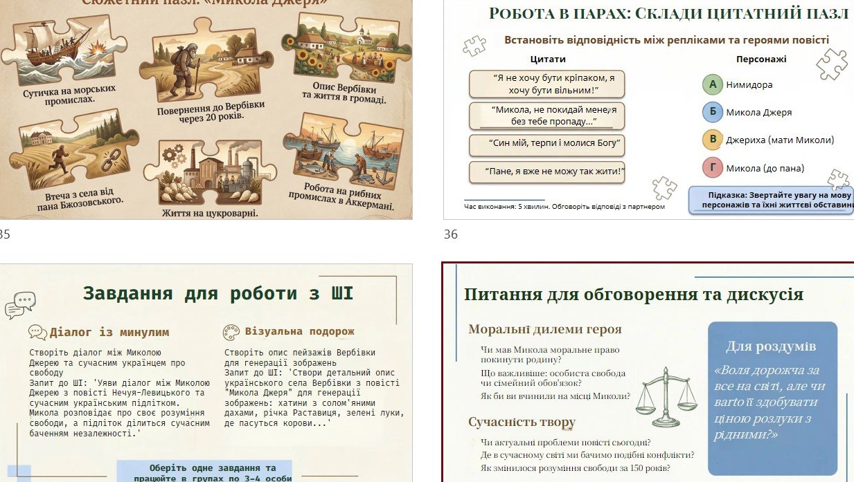 - практичні завдання – сюжетний пазл, відповідність “Цитата – герой”, робота в парах, завдання для роботи з ШІ, питання для обговорення та дискусія, онлайн-тести (активне посилання).
