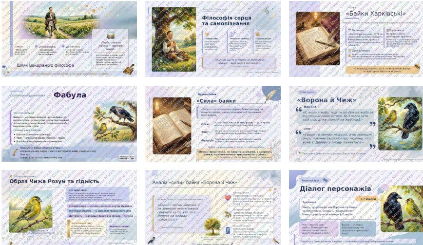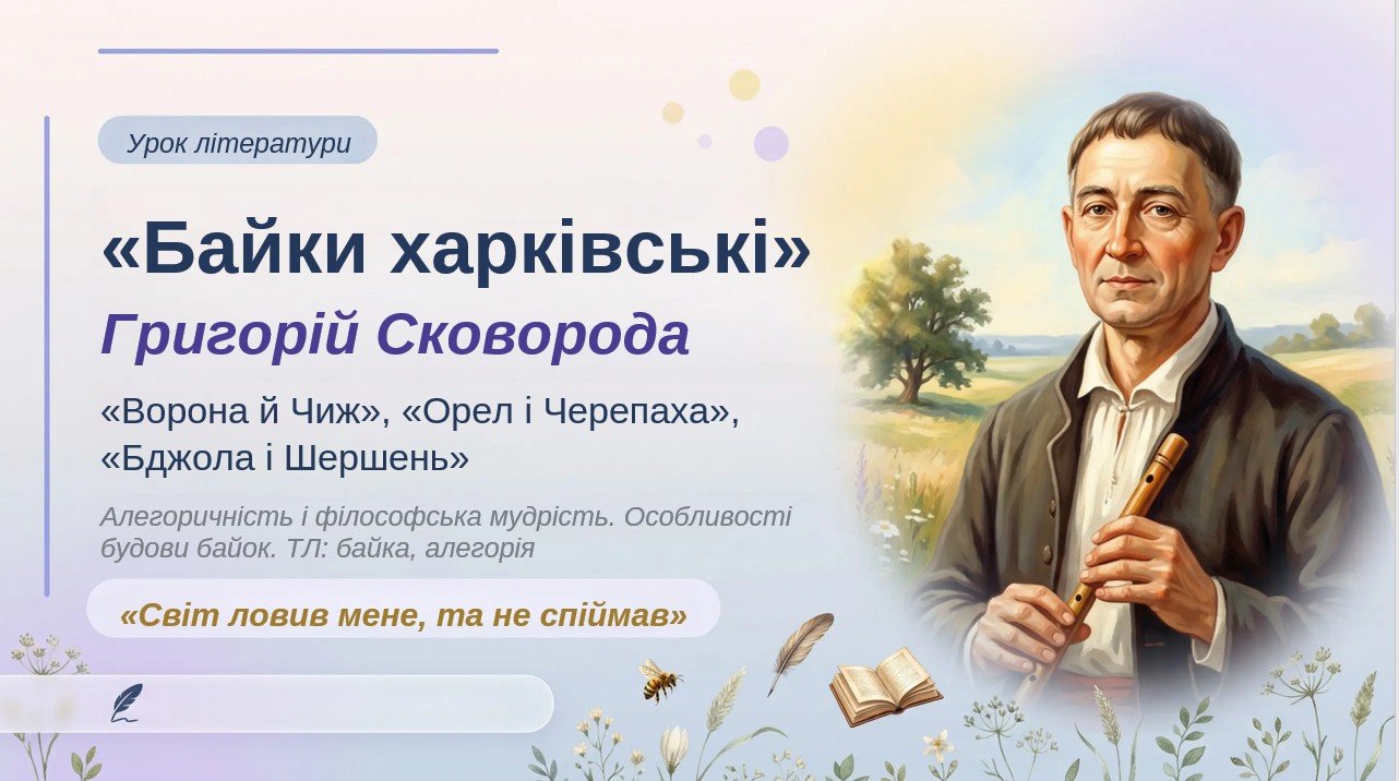 8 клас. Українська література. ПРЕЗЕНТАЦІЯ на тему “Григорій Сковорода. Байки «Ворона й Чиж», «Орел і Черепаха», «Бджола і Шершень» (із збірки «Байки харківські»). Короткі відомості про митця. Алегоричність і філософська мудрість у байках Г. Сковороди.. Особливості будови байок Г. Сковороди” МНП Заболотного. 49 СЛАЙДІВ!!!! Неперевершений дизайн презентації.