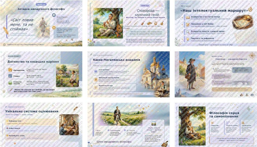Тема, WOW-хук “Загадка мандрівного філософа”, “Сковорода – музичний геній”, мета “Наш інтелектуальний маршрут”, актуалізація, криголам “Якби я був філософом”, про Григорія Сковороду біографія та цікаві факти, про збірку, Теорія літератури (байка, алегорія, будова байки), детальний аналіз кожної байки з питаннями для обговорення, паспортами творів, цитатами та підсумками.