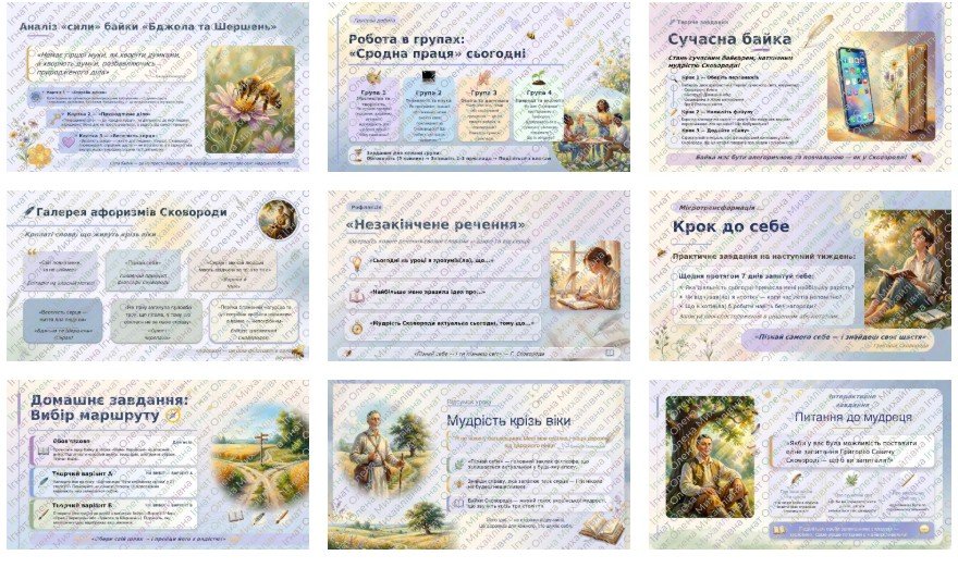 Практичний блок – робота в групах “Сродна праця” сьогодні”, творче завдання “Сучасна байка”, завдання для роботи з ШІ, порівняльна таблиця байок, галерея афоризмів, рефлексія “Незакінчене речення”, мікротрансформація “Крок до себе”, активні посилання на онлайн-кросворд та онлайн-гру “Так чи ні” для перевірки засвоєння опрацьованого матеріалу, диференційоване домашнє завдання, підсумок уроку, “Питання до мудреця”.