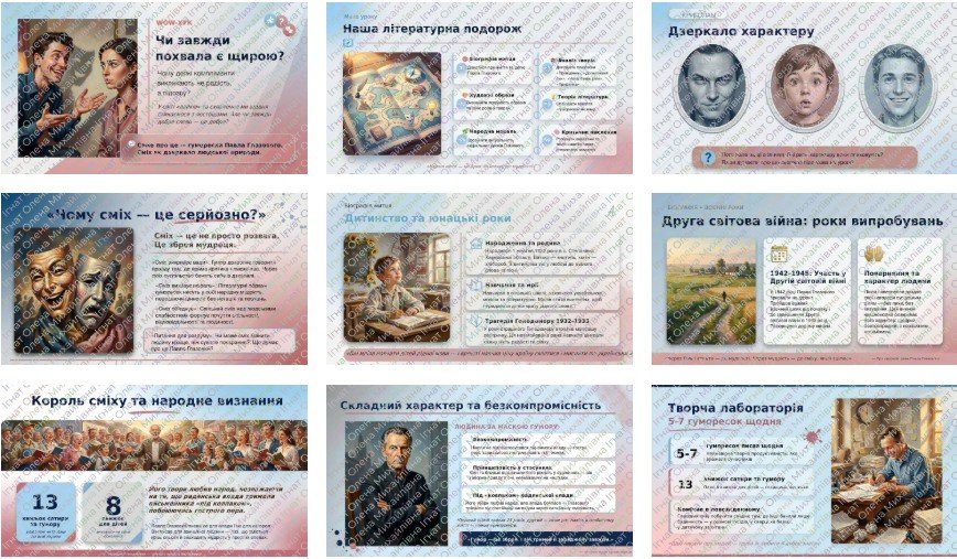 Тема, WOW-хук “Чи завжди похвала є щирою?”, мета “Наша літературна подорож”, криголам “Дзеркало характеру”, актуалізація “Що таке гумореска?”, класифікація гуморесок, “Чому сміх – це серйозно?”, про Павла Глазового, художні особливості творчості, яскравість образів, щирість та оптимізм у творах, ДЕТАЛЬНИЙ аналіз кожної гуморески з цитатами, активні посилання на аудіочитання гуморесок, паспорти творів.