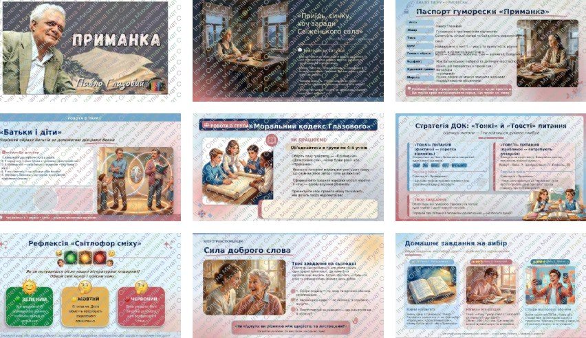 Практичний блок – робота в парах “Батьки й діти”, робота в групах “Моральний кодекс Глазового”, стратегія ДОК (“тонкі” й “товсті” питання), завдання для роботи з ШІ, активне посилання на онлайн-вікторину за матеріалами уроку, рефлексія “Світлофор сміху”, мікротрансформація “Сила доброго слова”, диференційоване домашнє завдання, підсумок, питання до автора та до себе.